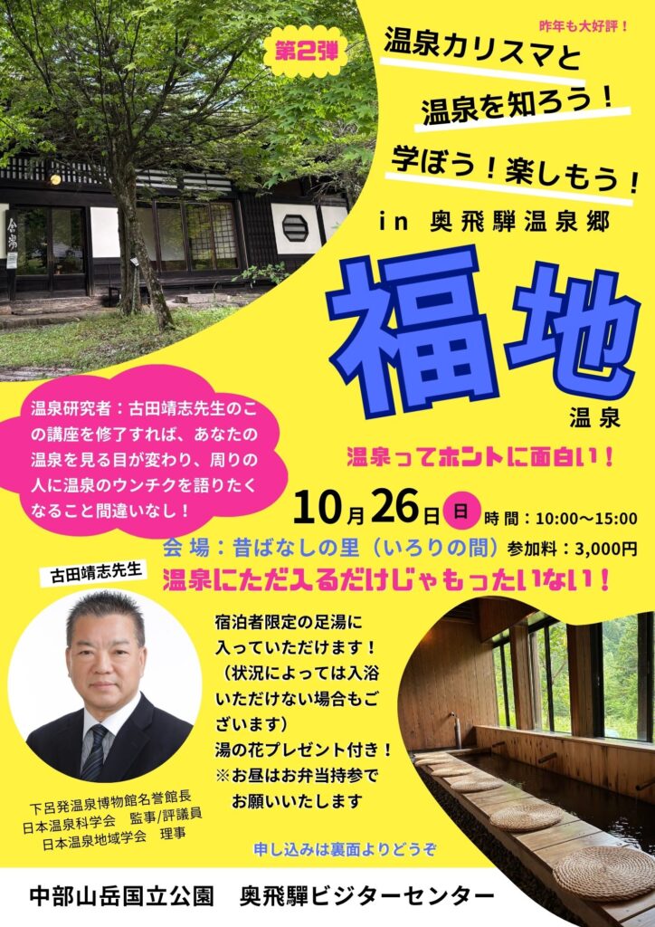 昨年は平湯温泉(奥飛騨ビジターセンター)で行い、大好評だった温泉講座。今回は福地温泉で第2弾を行います!