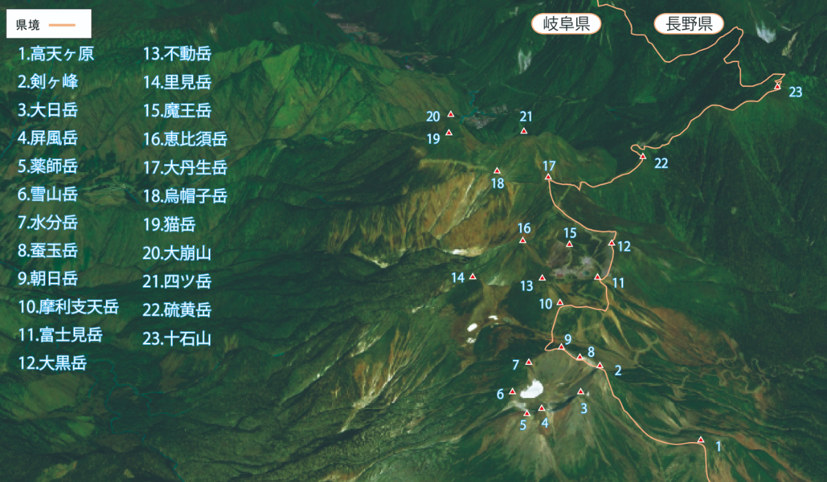 20. 大崩山(おおくえやま、又はおおくずれやま):標高2,523m。猫岳の北隣。昔、平湯地域に住む人たちから「西ケ谷の頭」と呼ばれていました。