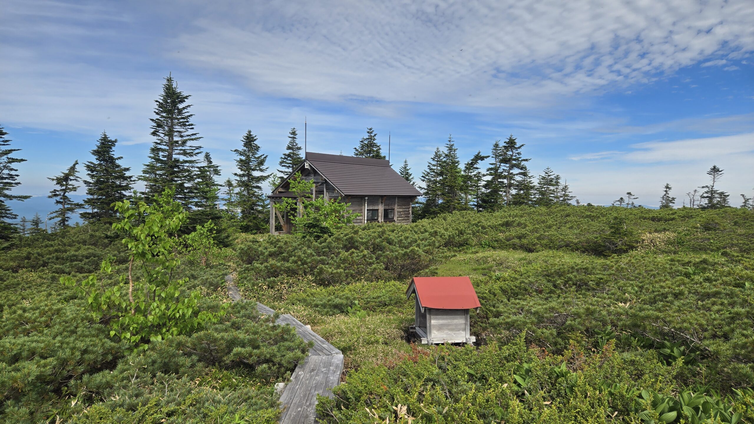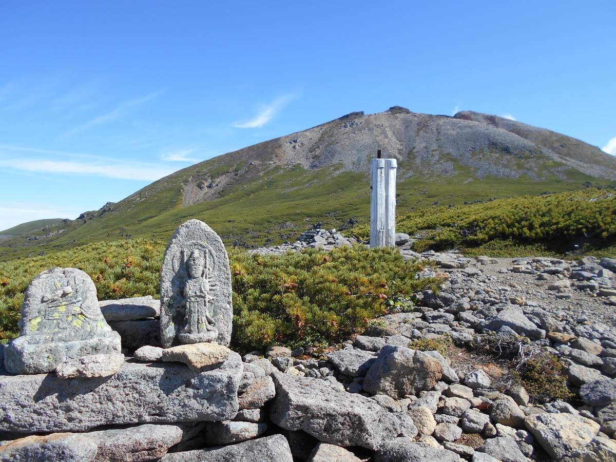 剣ヶ峰から下り中洞権現に到着します。広大な千町尾根とハイマツの海原、天気が良ければ遠く白山を望むことができます。また、南には美しい山容の霊山「御嶽山」を望むことができます。御嶽山最高峰の剣ヶ峰は、標高3,067mで今も噴煙を上げる活火山です。